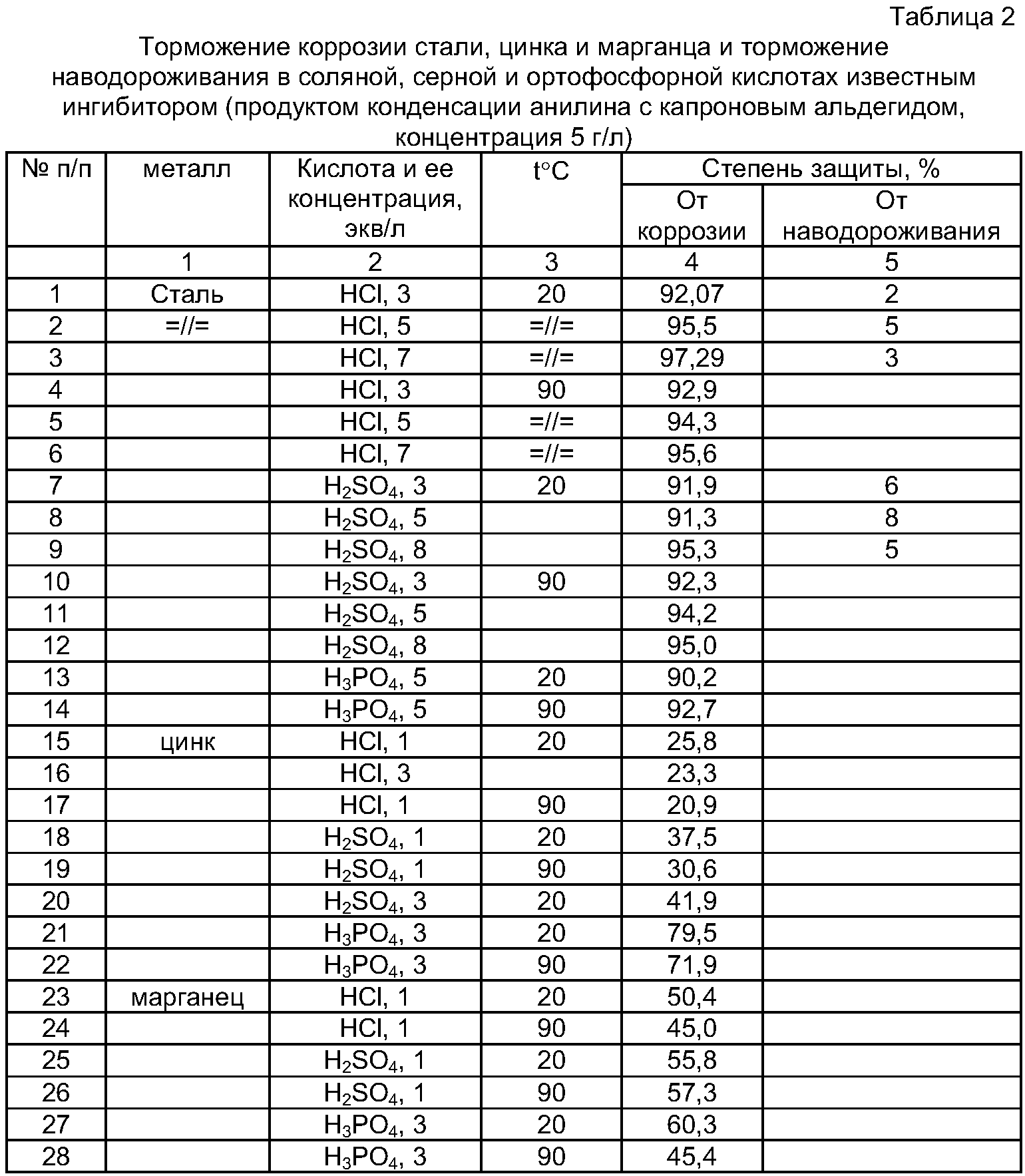 Для удобства приготовления раствора сообщаются также концентрации компонентов ингибитора в г/л (в той же последовательности): 1,0-1,7; 0,5-1,0; 1,9-5,4. При введении ингибитора в кислоты в первую очередь растворяют при перемешивании продукт конденсации, затем производное пиримидина и уротропин. Степень защиты металлов от коррозии определялась с помощью измерения масс образцов в чистых, а также ингибированных кислотах, а также по объему выделившегося водорода. Наводороживание стали оценивалось по числу оборотов образца до излома на крутильной машине К-5. Результаты, полученные при испытаниях образцов стали, цинка и марганца с предлагаемым ингибитором, приводятся в таблице 1. В таблице 2 собраны данные для известного ингибитора. Анализ результатов, приведенных в таблицах, позволяет сформулировать следующие заключения: 1. Разработанный ингибитор тормозит коррозию испытанных металлов более эффективно, чем известный, что особенно отчетливо проявляется для цинка и марганца. 2. Весьма значительно превосходство предлагаемого ингибитора над известным по наводороживанию стали. 3. В дополнительных экспериментах было показано, что предложенный ингибитор существенно превосходит широко применяемый в производственной практике ингибитор ПБ-5.Так, для последнего коэффициент торможения коррозии стали в 3 н. соляной кислоте составляет примерно 40 единиц, в то время как для предлагаемого ингибитора – более 100 единиц. Кроме того, предлагаемый ингибитор не коагулирует в кислотах при травлении трех исследованных металлов, а известный коагулирует. Таким образом, предлагаемый ингибитор проявляет более высокую эффективность по сравнению с известным как при защите от коррозии, так и от наводороживания. Предлагаемый ингибитор может быть рекомендован для травления стали, цинка и марганца в серной, соляной и ортофосфорной кислотах, а также при кислотных очистках оборудования, в котором имеются перечисленные металлы.