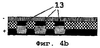 4. Фиг.4b изображает, как шаблон 3, который определяется задающим электродом 8, реплицируется на подложке 9. Материал, который стравливается, осажденный материал 13, весь осаждается на задающем электроде 8, внутри каждой локальной электрохимической ячейки.