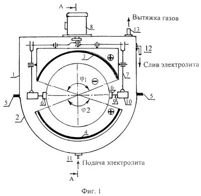 Устройство содержит узел для подвода электролита, выполненный в виде разъемного из двух половин 1 и 2 контейнера, посадочный диаметр которого соответствует диаметру подлежащей обработке шейки вала. Внутри контейнера смонтирован анод, состоящий из двух пустотелых для их охлаждения частей 3 и 4. При определенных условиях количество частей может быть более двух, например три или четыре. Части 3 и 4 выполнены из условия эквидистантности подлежащей обработке шейки вала с учетом зазора. Герметизация половин 2 и 3 обеспечивается эластичным уплотнением 5. Между частями анода 3 и 4 размещен инструмент для пластического деформирования 6, обеспечивающий к тому же удаление окислов, солей. Инструмент 6 связан тягой 7 с приводом 8 его возвратно-поступательного перемещения вдоль продольной оси контейнера, а тягой 9 – с приводом 10 – в радиальном направлении. В нижней половине 2 контейнера предусмотрен штуцер 11 для подачи электролита, а в верхней половине 3 контейнера – штуцер 12 для слива электролита и штуцер 13 для удаления образующегося в процессе электролита водорода.