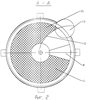 На представленных чертежах изображены: на фиг.1 показан общий вид устройства для получения волокнистых углеродных материалов; на фиг.2 – сечение по А-А, на котором показаны взаимное расположение диска, камеры-осадителя, скребка и емкости готового продукта; на фиг.3 показано сечение по Б-Б с расположением нагревательных элементов в виде заштрихованных дисков и на фиг.4 показан вариант – общий вид устройства с лопастями на диске.