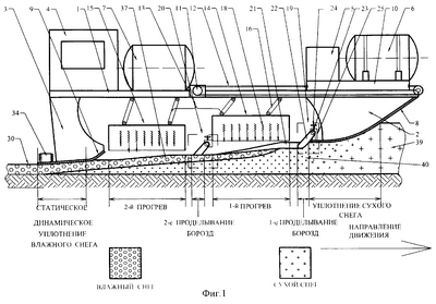 После тепловой обработки увлажненная на полную толщину снежного покрова снежная масса уплотняется статически – лыжей 9 при давлении 50-300 кПа, и динамически – вибраторами 34. Построенное дорожное полотно (полоса) 30 перед началом эксплуатации выдерживается до полного промерзания при температуре воздуха – 10°С – не менее 24 часов, ниже – 10°С – не менее 15 часов.