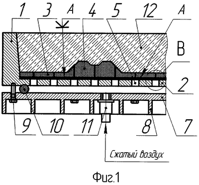 Опалубочная панель представляет собой геометрическое тело с боковыми стенками 1 и дном 2. На дне опалубочной панели установлена (приклеена ко дну опалубочной панели только по контуру) диафрагма 3 из эластичного пористого материала с объемными элементами орнамента 4, выполненными из того же материала. Опалубочная панель снизу снабжена герметичным поддоном 7 с ребрами жесткости 8. Поддон присоединяется ко дну опалубочной панели крепежом 9. Герметичность поддона обеспечивается прокладкой 10. Для подачи в поддон сжатого воздуха служит штуцер 11, 12 – бетон, 13 – клеевой слой, 14 – зона избыточного давления.