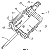 Первая часть 18 блока несет натяжное устройство 13 тягового средства с крюком 15 и регулировочное устройство 16, а также крышку 20, которая служит для разгрузки электрического кабеля 11 от натяжения, и расположенный сбоку контакт 21. Последний предназначен для контакта другой жилы электрического кабеля 11 с направляющей рейкой 3, так что с помощью этого контакта рабочая обмотка электромотора своим другим полюсом связана с электрическим кабелем 11.