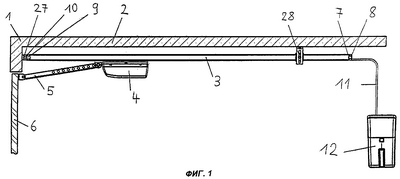 На фиг.1 показана часть гаража, а именно перемычка 1 ворот и крыша 2, на которых укреплено направляющее устройство, в данном примере выполнения направляющая балка или рейка 3, предпочтительно П-образного поперечного сечения (или в виде швеллера). На направляющей рейке подвижно установлена каретка 4, соединенная с помощью шарнирной тяги 5 с полотном 6 ворот гаража. Удаленный от полотна 6 ворот конец 7 направляющей рейки 3 закрыт первым вставным блоком 8, а обращенный к полотну 6 ворот конец 9 направляющей рейки 3 закрыт вторым вставным блоком 10. Первый вставной блок 8 несет электрический кабель 11, другой конец которого подведен к устройству 12 управления. Устройство 12 управления подсоединено к розетке (не показана), расположенной в задней части гаража.