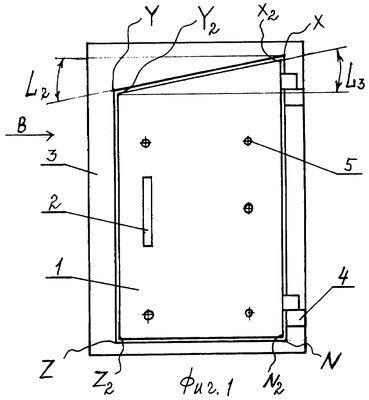 Коробка дверная содержит: внешнюю панель 3 (см. фиг.1, 3, 4, 5, 6, 7, 16, 18) с отверстием 26 четырехугольной формы с краями, внутреннюю панель 6 с отверстием 27, полость 7, ребро жесткости 28 (его может и не быть) и монтажные отверстия 29. Отверстие с краями 26 образовано четырехугольной формы, в частности по форме трапеции, содержащей две параллельные стороны – малое и большое основания и две непараллельные стороны, и включают в себя верхний участок XY, нижний участок ZN и боковые участки YZ и XN, причем боковые участки YZ XN образованы малым и большим основаниями трапеции, а верхний XY и нижний ZN участки образованы непараллельными сторонами трапеции и образуют острые углы L2 и L согласно фиг.16, 1, 3, 4. Угловой размер указанных острых углов обозначен выше по тексту. Края отверстия 27 внутренней панели 6 включают в себя верхний участок X1Y1, нижний участок Z1N1 и боковые участки Y1Z1 и X1N1 (см. фиг.16). Сквозная полость коробки дверной образована отверстием 27, частью отверстия 26 и частью полости 7, размещенных в зоне отверстия 27. Панели 3 и 6, имеющие поверхности «A1» и «А2», размещены друг против друга на расстоянии, равном V, и скреплены друг с другом с образованием полости 7, причем поверхности «A1» и «А2» обращены навстречу друг другу и в сторону полости 7. Ребро жесткости 28 образовано в виде края, отогнутого в сторону полости 7 панели 3. Монтажные отверстия 29 выполнены на боковой поверхности коробки дверной и предназначены для закрепления коробки к опорной поверхности проема. Коробка дверная выполнена из стального листа штамповкой (толщина листа равна 3-6 мм.) Внешняя панель 3 имеет боковые участки, имеющие ширину, равную V1 и V3, а внутренняя панель – V2 и V4 (см. фиг.18), причем V2 больше V1, а V4 больше V3, преимущественно, V2=1, 2…1, 4 V1, a V4=1, 2…1, 4 V3, причем V1 и V3 могут быть равны между собой, а могут быть и не равны. V2 и V4 могут быть равны между собой, а могут быть и не равны. Обозначим периметр отверстия 27 – P1, а периметр отверстия 26 – Р2. Можно указать, что Р2 больше Р1, в частности Р2=1, 2…1, 4 P1. Запорный элемент коробки дверной образован частью полости 7 и частями панелей 3 и 6 (краями отверстий 26, 27), которые размещены на боковых участках YZ и Y1Z1 на верхних участках XY и X1Y1 или/и на нижних участках ZN, Z1N1.