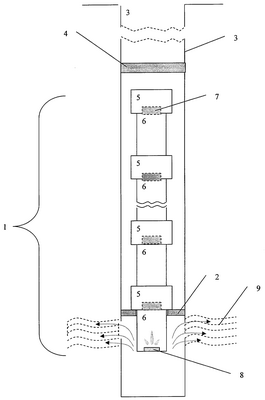 Работа предлагаемого устройства состоит в следующем. В обсадную трубу 3 над призабойной зоной 9 устанавливают ограничительное кольцо 2. Последовательно из генераторов 5 и 6 с помощью резьбового соединения 7 путем взаимного их навертывания собирают газогенерирующий стержень 1 и опускают его тросом в трубу 3 до остановки на ограничительном кольце 2. Затем над стержнем 1 устанавливают пакер 4 для теплоизоляции зоны горения. После установки пакера 4 включают с помощью датчика времени воспламенитель 8. При этом загорается медленно горящий пиротехнический состав теплового генератора 6. Газы горения генератора 6, взаимодействуя со скважинной водой и флюидом, образуют парогазовую смесь с температурой 200÷700°С, которая через перфорационные отверстия в обсадной трубе 3 проникает в призабойную зону 9. Проникающая парогазовая смесь расплавляет АСПО в имеющихся порах и трещинах. После сгорания (30÷60 с) теплового генератора 6 пламя последнего переходит на импульсный генератор 5 с быстрогорящим газогенерирующим составом. При этом за счет быстрого сгорания высокоэнергетического топлива СБК массой 0.4÷0.6 кг генератора 5 за единицы секунд возникает импульс давления парогазовой смеси с энергией 3-6 МДж и мощностью 1.25-4 МВт, вызывающий расширение существующих пор и образование новых микротрещин. После сгорания генератора 5 стержень 1 под действием собственного веса перемещается вниз на величину длины теплового генератора 6. При этом на место сгоревшей пары теплового 6 и импульсного 5 генератора устанавливается новая пара аналогичных генераторов. Последующий тепловой импульс вымывает из образовавшихся трещин АСПО. Далее процесс обработки призабойной зоны скважины импульсами давления и тепловыми импульсами автоматически повторяется до полного сгорания генераторов 5, 6 стержня 1.