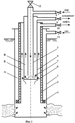 На фиг.1 показана схема осуществления предлагаемого способа добычи высоковязкой нефти, содержащей большое количество асфальтосмолопарафинистых веществ.