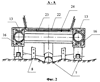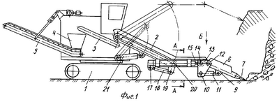 Между стрелой 2 и рабочим органом 6 установлен телескопический приемный конвейер (поз. не обозначен), выполненный в виде двух вибролент: вибролента 22 (фиг.2) закреплена на раме 23, соединяющей корпусы 16 напорных гидроцилиндров 15, а вибролента 24 – на кронштейне-ползуне 13.