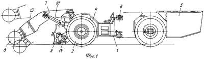 Известен скрепер для дорожных работ с фрезерным барабаном, установленным перед скрепером (см. патент Германии №4012280, кл. Е 01 Н 5/04, 1989 г.). Этот скрепер оснащен механизмами подъема и опускания и поворота в горизонтальной плоскости рабочих органов. Конструкция фрезерного барабана предусматривает использование дисковых фрез, расположенных на поверхности барабана со смещением. Этот скрепер обладает более высокой мощностью обработки грунта и более высокой маневренностью, чем предыдущая машина, но также не годится для работы в горных выработках: ему не развернуться в горных выработках и не добраться до труднодоступных мест, фрезерный барабан не сможет эффективно осуществлять поддир спекшейся горной массы, нарушения технологического процесса обработки трасс в горных выработках приведут к невозможности его использования.