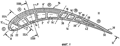Таким образом, второй охлаждающий контур В служит для охлаждения задней части пера лопатки 1. В предпочтительном варианте с целью усиления теплопереноса вдоль вогнутых и выпуклых стенок полостей 16, 16 и 16 эти полости снабжены дефлекторами 38, расположенными на внутренних стенках указанных полостей напротив друг друга.