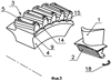 – фиг.9, 10, 11, 12 показаны этапы сборки рабочего колеса. Рабочее колесо (см. фиг.1, 2, 3) турбомашины содержит рабочие лопатки 1, установленные своими хвостовиками 2 в продольные, например елочные, пазы 3 диска 4, которые, образуя между собой выступы 5, пересекают ободную часть последнего. Сзади на хвостовике 2 лопатки 1 (см. фиг.4, 5) расположен продольный выступ 6, имеющий поперечную прямоугольную канавку 7, открытую к продольной оси колеса и ограниченную сзади буртом 8.