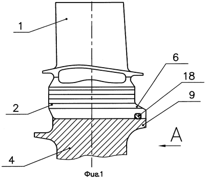 В собранном с лопатками колесе турбины (см. фиг.1, 2) контровка 18 устанавливается в окно 20 (см. фиг.9), образованное канавкой 7 на выступе 6 хвостовика 2 лопатки 1 и донной поверхностью 11 канавки 10 диска 4 при совмещении указанных канавок 7 и 10.