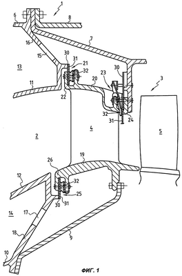 Удерживающее устройство содержит закругленный свободный конец 32 прижимной лапы 33, прикрепленной к одному из секторов, например S1, при помощи двух заклепок 40а, 40b, закрепленных, соответственно, в выступах 41а, 41b элемента полки 19 или 20. Стержни этих заклепок проведены сквозь отверстия, выполненные в прижимной лапе 33, прокладке 30a и стыковых накладках 31а и 31b. Противоположный по отношению к свободному концу 32 конец 34 лапы 33 загнут в форме буквы U и содержит цилиндрические отверстия 50а, 50b, обеспечивающие фиксацию в периферическом направлении (по окружности); таким образом, этот конец 34 фиксируется в аксиальном направлении. Соединение между заклепкой 40b и лапой 33 обеспечено скобой 43, которая прижимает средний участок лапы 33 к прокладке 30a, причем в периферическом направлении это соединение не зафиксировано. Как показано на фиг.3, лапа 33 проходит в периферическом направлении над элементом полки сектора S1. Однако ее свободный конец 32, прилегающий к стыковой накладке 31а, находится вне сектора S1 и в примере, представленном на фиг.2 и 3, в зоне сектора S2. Из фиг.3 видно, что противоположные концы стыковой накладки 31 содержат вырезы 35, через которые проходят стержни соседних заклепок, расположенных в смежных секторах S1 и S2.