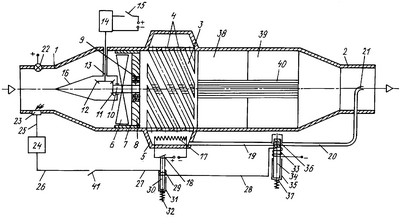 За сажеотделителем в устройстве для очистки отработавших газов дизеля от сажи размещены восстановительный 38 и окислительный 39 блоки, предназначенные соответственно для нейтрализации оксидов азота, углеводородов и оксида углерода. В центре восстановительного 38 и окислительного 39 блоков размещено каталитическое дожигающее устройство 40, предназначенное для сжигания мелких частиц сажи при контакте с керамикой, поры которой покрыты металлами-катализаторами. Основу пористой керамики составляет оксид алюминия с добавлением оксидов Cu, Cr, Ni и Со.