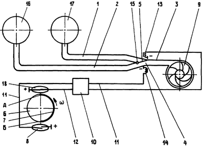 Электромагнитная система управления заслонкой 5 состоит из вращающегося диска 6 с закрепленным на нем постоянным магнитом 7, герконов 8 и 18, соединенных через усилитель электрического тока 10 и электрические проводники 11 и 12 с соленоидами (катушки с сердечниками) 13 и 14. Вращающийся диск 6 имеет угловую скорость вращения, в два раза меньшую по сравнению со скоростью вращения коленчатого вала двигателя.