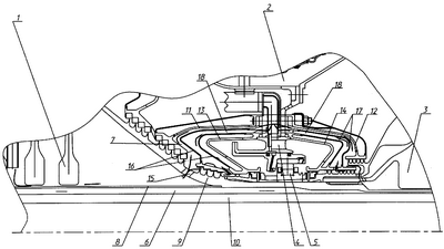 При работе двигателя охлаждающий воздух первой полости охлаждения 6, который отбирается из проточной части, например, перед компрессором 1, проходит внутри ротора под трубой 8 и далее направляется между валами 9 и 10 в сторону турбины 3. Воздух второй полости охлаждения воздуха 7 отбирается из-за середины компрессора высокого давления и направляется между трубой 8 и ступицами дисков и далее через перепускные отверстия 15 вала 9 внутри наружных фланцев 11 и 12 и далее на охлаждение ротора турбины. Вторая полость охлаждения 7, служащая для охлаждения ротора турбины, также теплоизолирует опору 5 подшипника 4 от подвода тепла со стороны камеры сгорания. Полость сброса воздуха 18, образованная обечайками 16, 17 внутри второй полости охлаждения 7, исключает попадание утечек горячего воздуха в масляную полость подшипника 5, что также повышает надежность турбокомпрессора.