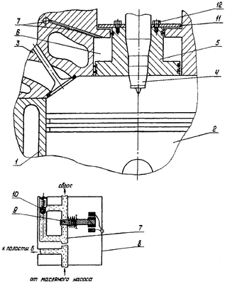 На чертеже изображено устройство регулирования степени сжатия двигателя внутреннего сгорания на пусковых режимах.