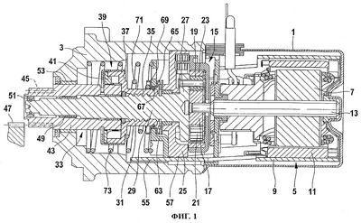 Для каждой лапки 55 полюсной трубки 9 диск 63 имеет на его наружном крае углубление 75, размеры которого подобраны с таким расчетом, чтобы каждая из лапок 55 полюсной трубки 9 входила в это углубление без зазора в радиальном направлении, но могла перемещаться в нем в осевом направлении. Тем самым диск 63 при повороте полюсной трубки 9 может поворачиваться вместе с ней на поводковом хвостовике 31, но одновременно с этим может также перемещаться в осевом направлении относительно полюсной трубки 9. Диск 63 имеет по меньшей мере один выпуклый участок 77, обращенный в осевом направлении к полюсной трубке 9. В зоне каждого такого выпуклого участка 77, имеющегося у диска 63, на неподвижной промежуточной опоре 25 имеется обращенный к диску 63 осевой выступ 79. Этот выступ 79 имеет направляющую поверхность 81, по которой может скользить имеющийся у диска 63 выпуклый участок 77, при этом выпуклому участку 77 и сопряженной с ним направляющей поверхности 81 придана такая форма, чтобы диск 63 при скольжении его выпуклого участка 77 по направляющей поверхности 81 перемещался вперед в сторону шестерни привода.