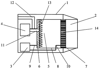 Электрореактивный двигатель имеет цилиндрический корпус (1) с выходным устройством (соплом) (2) для выхода реактивной струи в окружающее пространство. В корпусе установлен блок питания (3), включающий источник электрической энергии постоянного тока и электронную систему управления, электрически связанную с источником электрической энергии. Электронная система управления состоит из преобразовательных, распределительных, регулирующих, блокирующих и защитных устройств, выполненных в виде отдельных модулей. В корпусе также установлена емкость (4) с газообразным рабочим телом и газоразрядная камера (5). Газоразрядная камера состоит из двух электродов, а именно из источника электронов (6) и приемника (он же нейтрализатор) электронов (7), заключенных в кожух (8), выполненный из непроводящего электрический ток материала. Источник электронов (6) подключен проводником (9) к потенциалу отрицательной полярности источника электрической энергии через электронную систему управления. Приемник электронов (7) подключен проводником (10) к потенциалу положительной полярности источника электрической энергии также через электронную систему управления и установлен на расстоянии от источника электронов, многократно превышающем длину свободного пробега электронов в газообразном рабочем теле. Такое расположение электродов обеспечивает режим работы двигателя без возникновения лавинного пробоя между ними, а следовательно, экономичный режим. Источник электронов снабжен каналом (11) для подвода газообразного рабочего тела, например ксенона. Использование в качестве газообразного рабочего тела ксенона обусловлено его высоким молекулярным весом, равным 130,2. Вход канала подсоединен к емкости (4) или может сообщаться с атмосферой по дополнительному каналу (12) в случае использования в качестве рабочего тела воздуха, особенно при работе двигателя в плотных слоях атмосферы. Выход канала (11) подсоединен к межэлектродному пространству (промежутку) у источника электронов (6). Источник электронов и приемник электронов выполнены в форме токопроводящих пластин. Для увеличения тяги двигателя (повышения экономичности) путем увеличения количества молекул газа, выходящих из двигателя в окружающую среду, поверхность источника электронов, обращенная к приемнику электронов, имеет многоигольчатую структуру (13). В пластине приемника электронов выполнены отверстия (14) с образованием сетчатой или сотовой структуры для входа и выхода реактивного потока молекул. Предусмотрено, что для повышения количества заряженных молекул в газоразрядной камере (5) и, как следствие, повышение экономичности двигателя острия многоигольчатой поверхности источника электронов могут быть выполнены из алмазоподобного материала ( -СН). Выполнение источника электронов с многоигольчатой структурой и из специального материала существенно снижает затраты энергии на выход электронов, что и приводит к повышению КПД двигателя. С целью предотвращения лавинного пробоя между электродами (следовательно, для обеспечения более экономичного режима работы двигателя), рекомендуется, чтобы величина работы выхода электронов находилась в пределах от 1,5 до 4,5 электронвольт. Для упрощения конструкции двигателя токопроводящие пластины источника и приемника электронов могут быть выполнены в форме 