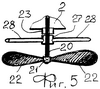 Вместо отбойника 25 на валу 20 может быть установлена чашкообразная распределительная цилиндрическая обойма 27, например, при помощи сварки. К обойме 27 подсоединены реактивные трубки 28, например, при помощи сварки, окончания которых имеют загиб в противоположную сторону относительно направления их вращения в рабочем состояния устройства. Верхние края обоймы 27 расположены вплотную к выступу 23, в данном примере без козырька 24, но с возможностью совместного вращения с валом 20. В данном примере выступ 23 и обойма 27 в комплексе представляют собой ступицу, на которой установлены реактивные трубки 28 (фиг.5).