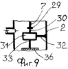 В разрыве канала 1 может быть установлен кольцевой теплообменник 34, т.е. часть канала 1 представляет собой плоский, полый, кольцеобразный воздуховод, трубопровод для жидкости или пара, при этом части канала 1 и теплообменник 34 соединены, например, при помощи сварки. Центр кольцевого теплообменника 34 может совпадать с осью привода 2. На выходе привода 2, после его ротора 7, может быть подсоединен отводящий провод 35 для среды под давлением, например трубопровод. Провод 35 может быть подсоединен к корпусу привода 2 при помощи сварки. Ротор 7 может быть соединен с диском 36 из магнитоактивного материала, например из стали 3, при помощи сварки. Диск 36 установлен в приводе 2 вблизи перегородки 37, при этом она выполнена из немагнитного материала, например из цветного металла или нержавеющей, хромосодержащей стали, или пластмассы и расположена в корпусе привода 2 ниже ввода в него канала 1. С противоположной стороны перегородки 37, вблизи нее, на круглой пластине 3 установлены магниты 38, например приклеены к ней. Пластина 39 закреплена на валу 20, например приварена к нему, а вал 20 зафиксирован с возможностью вращения вокруг своей оси в направляющей втулке 40, например в подшипнике, установленной в основании привода 2. Перегородка 37, разделяющая корпус привода 2 на две части, нижнюю, в которой размещены магниты 38, и верхнюю, в которой размещены диск 36 и ротор 7, может крепиться между фланцами 41, которые привариваются к обеим частям корпуса привода 2 (фиг.7 и 8).