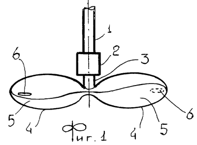 Окончание ротора 7 привода 2 может быть зафиксировано в направляющей втулке 8 с возможностью вращения вокруг своей оси, при этом втулка 8 закреплена на внутренней поверхности привода 2 при помощи распорок 9, например при помощи сварки. Противоположное окончание ротора 7 может быть жестко закреплено на торцевой заглушке 10, например приварено к ней. Заглушка 10 установлена с торца патрубка, представляющего собой полый вал 3 привода 2, например приварена к нему с возможностью совместного вращения, вблизи заглушки 10, в патрубке выполнены отверстия 12, расположенные во внутренней части корпуса привода 2. На окончании патрубка установлены полые лопасти 4, в которых выполнены полости 15 и со стороны задних кромок – приводные отверстия 16. Отверстия 12 через полости патрубка, полости 15 и приводные отверстия 16 соединяют внутреннюю полость привода 2 с окружающим пространством лопастей 14 (фиг.2).