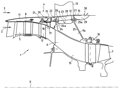 Представленный на чертеже двухконтурный турбореактивный двигатель 1 с осью Х содержит в своей передней части не показанный на чертеже вентилятор, подающий воздух в первичный кольцевой воздушный контур 2 и во вторичный кольцевой воздушный контур 3, отделенные друг от друга межконтурным картером 4.