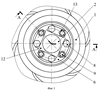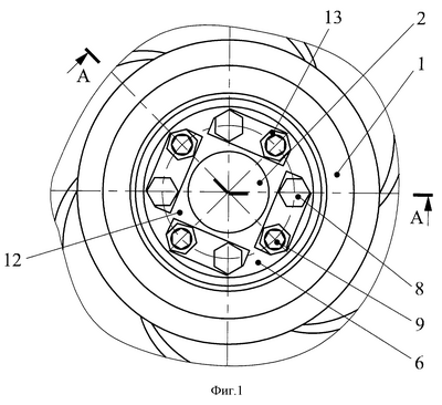 Необходимое усилие осевой затяжки разрезного центрирующего конуса 3 и рабочего колеса 2 создают с помощью последующего вращения винтов 6 и гаек 13.