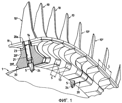Когда сборка завершена, лопатки 10 и крепежные лопатки 10 входят в контакт друг с другом вдоль кромок их платформ 11, перпендикулярных направлению скольжения лопаток, и между хвостовиками 13 двух пар смежных крепежных лопаток 10 остается пространство для помещения блоков 20.