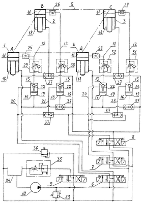 Гидравлический привод содержит две задние гидроопоры 1, 2 и две передние гидроопоры 3, 4, установленные на грузовой платформе 5, трехпозиционные четырехлинейные распределители 6-9 и источник питания (насос) 10. Поршневые полости 11 гидроопор 1-4 через магистрали 12 соединены соответственно с надклапанными полостями 13 односторонних гидрозамков 14-17, предназначенных для фиксации платформы 5 в поднятом положении. Одно выходное отверстие распределителя 6, служащего для обеспечения движения задних гидроопор 1 и 2, сообщено со штоковыми полостями 18 этих гидроопор и с управляющими камерами 19 гидрозамков 14 и 15, а другое выходное отверстие распределителя 6 через магистрали 20, 21 сообщено с подклапанными полостями 22 этих гидрозамков. Аналогичным образом одно выходное отверстие распределителя 7, предназначенного для осуществления движения передних гидроопор 3 и 4, сообщено со штоковыми полостями 18 этих гидроопор и с управляющими камерами 19 гидрозамков 16 и 17, а другое выходное отверстие распределителя 7 через магистрали 23, 24 сообщено с подклапанными полостями 22 этих гидрозамков.