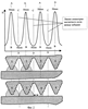 Заправка магнитной жидкостью рабочего зазора между полюсными приставками и валом уплотнения производится следующим образом. На время заправки из заправочного канала удаляется заглушка 10 (фиг.1, б), включается клапан 8, при этом межзубцовые полости 6 через каналы 7 и клапан соединяются с атмосферой. Под многозубцовым полюсом существует волнообразное распределение магнитного поля, чередование максимумов и минимумов напряженности (фиг.2). Линии АВ – линии максимальной напряженности магнитного поля под зубцами. Линии CD – линии минимальной напряженности магнитного поля под зубцами, их можно условно назвать линиями симметрии магнитного поля, разделяющими магнитные поля двух соседних зубцов. При смещении от каждой линии CD хоть вправо, хоть влево напряженность поля будет возрастать. В зазоре магнитная жидкость стремится в первую очередь занять области с максимальной напряженностью поля.