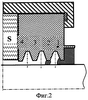 Уплотнение работает следующим образом. Постоянный магнит 2 в уплотнении служит источником магнитного поля. Создаваемый им магнитный поток полюсными приставками 3 подводится к зазору с валом 4. Зубцы полюсных приставок 5 перераспределяют магнитный поток в зазоре, и магнитное поле становится резко неоднородным. Магнитная жидкость 7 вводится в камеру 6 и удерживается от вытекания магнитным полем камеры. Магнитная жидкость втягивается магнитным полем под первый со стороны камеры зубец, и небольшой ее объем перескакивает под второй зубец. В замкнутой полости между первым и вторым зубцами создается повышенное давление, которое препятствует дальнейшему проникновению жидкости в зазор. В таком состоянии уплотнение готово к работе и может находиться в изделии или на складе. Если уплотнение находится в действующей установке, при повышении давления перед уплотнением магнитная жидкость будет проталкиваться в рабочий зазор и перераспределяться между зубцами (фиг.3), где она втягивается в области с максимальной напряженностью и образует герметичные магнитожидкостные пробки. Каждая пробка способна воспринимать перепад давлений, который определяется по формуле: