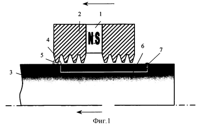 Процесс заправки уплотнения по данному способу производится следующим образом. Первоначально магнитную систему уплотнения путем перемещения ее вдоль вала располагают таким образом, чтобы выходное отверстие заправочного канала находилось под первым зубцом (фиг.1). Через заправочный канал под первый зубец вводят требуемый объем магнитной жидкости, рассчитанный исходя из распределения магнитного поля и геометрии рабочего зазора. Затем магнитную систему или уплотнение перемещают вдоль оси вала таким образом, чтобы выход заправочного канала оказался под вторым зубцом (фиг.2). При перемещении магнитной системы весь объем введенной магнитной жидкости удерживается магнитным полем первого зубца и перемещается вместе с ним. Через заправочный канал вводят магнитную жидкость уже под второй зубец, и снова перемещают магнитную систему. Так последовательно один за другим заправляют все зубцы уплотнения. После чего заправочный канал на входе закрывают герметичной заглушкой 7 (фиг.3). Последовательность заправки зубцов может быть различной. После окончания процедуры заправки выход заправочного канала может быть возвращен в исходное положение, а также размещен как вне магнитной системы, так и в ее пределах.