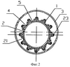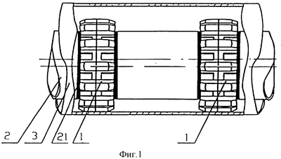 Кроме того, смещению также препятствуют продольный выступ 17 (фиг.4), выполненный в форме полуокружности, и два продольных выступа 18, 19, выполненных в форме треугольника ребром наружу на внутренних поверхностях сегментов, которые при сборке вдавливается в резиновую прокладку 21 (фиг.1, 14, 15) и создают прочное крепление опорных пластмассовых колец 1 (фиг.1, 17) на трубопроводе 2 (фиг.1.17). Выполненная канавка 20 (фиг.4) по всей ширине сегмента способствует предотвращению смещения кольца на трубопроводе за счет того, что в период сборки при обжатии кольца резиновая прокладка 21 (фиг.1, 14, 15) уплотняется и в входит в канавку 20, образуя выступ, тем самым предотвращая осевое и радиусное смещение кольца 1 (фиг.1). Кольцевые выступы 17 (фиг.4), выступы в форме треугольника 18, 19 на внутренней поверхности сегментов и выступы от резиновой прокладки 21 (фиг.1) создают единое целое каждого опорного кольца, что предотвращает осевое и радиусное смещение опорных пластмассовых колец 1 (фиг.1) относительно магистрального трубопровода 2 при протаскивании его в защитный кожух (футляр) 3 (фиг.1, 2).
