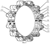 Затем медленным вращением рукоятки 38 (фиг.11) против часовой стрелки захваты 27, 28 (фиг.11) устройства разъединяют сегменты 4, 5 (фиг.11) опорного пластмассового кольца друг от друга за счет оставшихся тангенциальных нагрузок и выводят через совмещенное свободное пространство приемного узла 6 заходный узел 9 (фиг.11) за пределы кольца.