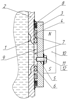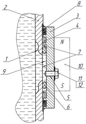После ультразвукового исследования выяснилось, что на трубопроводе неповрежденная область стенки 2 вокруг участка повреждения 1 составила примерно 8×5 см2. Для второй емкости выбрали заплату 3 диаметром 160 мм с уплотнением 4 в виде резинового кольца диаметром 140 мм и резьбовым каналом М8, смещенным от оси заплаты 3 на 40 мм. Причем внутренняя плоскость заплаты 3 повторяла контур стенки 2 трубопровода. После чего вокруг участка поражения 1 стенки 2 образовали буртик 6 из пластичного материала (пластилина) диаметром примерно 110 мм. Затем вокруг буртика 6 наружную поверхность 7 до диаметра примерно 180 мм зачистили при помощи металлической щетки, наждачной бумаги и ацетона, а затем высушили с использованием бумажных полотенец. По периметру заплаты 3 снаружи уплотнения 4 нанесли клеевую композицию 8 (анаэробный герметик “Трибопласт-9А”, ТУ 2257-004-25669359-98), которую обработали анаэробным активатором (“Трибопласт-100, ТУ 2257-003-0486215-04). Установили заплату 3 до плотного взаимодействия уплотнения 4 и клеевой композиции 8 с зачищенной и высушенной поверхностью 7 стенки 1, сминая в середине буртик 6 заплатой 3 так, что отклонение канала 5 от оси заплаты 3 располагалось внизу. После чего заплату 3 зафиксировали относительно стенки 2 при помощи внешнего источника магнитного поля 10 (постоянного магнита). Жидкость при этом из полости 9 вытекала через канал 5 заплаты 3 и собиралась в резервуар (на чертеже не показан). После отверждения клеевой композиции 8 (выдерживали около одного часа) магнит 10 удалили, а канал 5 заплаты 3 герметично перекрывали при помощи резьбовой заглушки 11 с уплотнением 12 (резиновым кольцом, смазанным анаэробным герметиком: “Трибопласт-6А”, ТУ 2257-003-25669359-98).