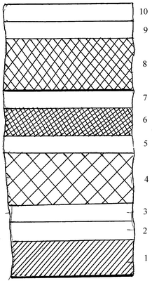 Пакет криогенной теплоизоляции и теплозащиты состоит из следующих слоев (от металла) – см. чертеж, на котором показана последовательность слоев обечайки, где поз.1 – это изолируемая поверхность – металл, поз.2 – антикоррозионное покрытие – грунт ЭП-0214, поз.3 – амортизационный слой – подслой Криосил-Р, поз.4 – теплоизоляционный слой – пенопласт Изолан-10, поз.5 – влагозащитное покрытие – клей АДВ-5 (один слой), поз.6 – крепление пенопласта – сеть капроновая Дель, поз.7 – влагозащитное покрытие – клей АДВ-5 (второй слой), поз. 8 – теплозащитное покрытие пенопласт ППУ-Т, поз.9 – влагозащитное покрытие АДВ-5, поз.10 – лакокрасочное покрытие (эмаль ХП-5237, эмаль ХВ-16+4% алюминиевой пудры, эмаль ХВ-16).