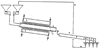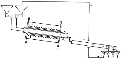 В бункере-питателе для сырьевого материала 3 находятся гранулы материала, который в дальнейшем подвергается термообработке. В бункере-питателе для сыпучего теплоносителя 4 находится сыпучий теплоноситель, например карьерный песок, сухая растертая глина, базальтовый песок или иной термостойкий материал. Из бункеров-питателей 3 и 4 сырьевой материал и сыпучий теплоноситель поступают во вращающийся барабан 1. Вращающийся барабан 1 установлен с уклоном в сторону выгрузки, поэтому при его вращении происходит постепенное перемещение материала, находящегося внутри его в сторону уклона, то есть к стороне выгрузки. Барабан 1 расположен внутри печи 2, поэтому материал, продвигающийся внутри печи, подвергается термической обработке. Внутри вращающегося барабана 1 выполнены продольные ребра 7, высотой не более диаметра получаемых в процессе термообработки гранул. При вращении барабана ребра 7 препятствуют скольжению материала вдоль стенки, материал приподнимается каждым ребром и пересыпается через него. Такое движение материала способствует улучшению теплообмена и повышению качества продукта. В процессе термообработки сырцовые гранулы переходят в термопластичное состояние и за счет выделяющихся газов увеличивают свой объем в несколько раз. На выходе из барабана 1 термообрабатываемый материал попадает в зону закалки, представляющую собой не обогреваемую печью 2 часть барабана, составляющую не менее 1/10 ее длины, где происходит постепенное понижение температуры материала и его закалка. На выходе из барабана 1 термообработанный материал поступает по течке 5 в барабан холодильника 6, который представляет собой вращающуюся трубу 9. Труба 9 расположена с уклоном в сторону зоны выгрузки, поэтому внутри нее при вращении также происходит постепенное перемещение материала вдоль оси трубы 9 к выходу. Материал в ходе такого движения постепенно остывает и достигает окон 10-12. Эти окна выполняют роль разгрузочных и сепарационных устройств за счет того, что они закрыты сетками, причем ячейка сетки последовательно увеличивается по ходу длины барабана и размер ячеек первой сетки 10 соответствует прохождению теплоносителя, а размер ячеек сеток других окон 11-12 соответствует размеру получаемых фракций гранулированного материала, поступающего в емкости готовой продукции 15. Теплоноситель имеет самый маленький размер частиц, поэтому он отделяется на первой, самой мелкой сетке 10, поступает в емкость 13, откуда транспортером 14 он возвращается на вход в барабан 1 через бункер-питатель 4. Готовый продукт – гранулированный пеносиликат – из бункеров 15 по фракциям поступает на склад готовой продукции.