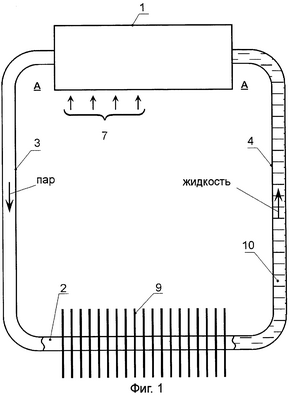 На фиг.1 представлена схема теплопередающего устройства, представляющая вариант исполнения, в котором испаритель и резервуар размещены в одном корпусе, а конденсатор выполнен в виде оребренного участка трубопровода, заключенного между паропроводом и конденсатопроводом;