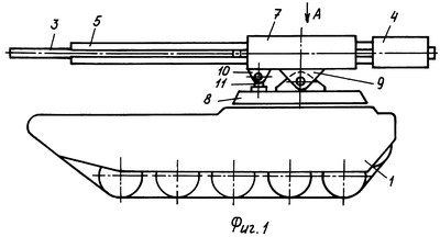 На вращающейся площадке с помощью шарнирного соединения 9 закреплена съемная опорная рама с орудием и контейнерами с боекомплектом. Ближе к краю площадки опорная рама снабжена звеном 10, соединяющим ее с механизмом вертикального перемещения 11.