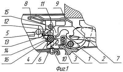 При накате затворной рамы она взаимодействует с передним плечом 9 рычага 7, поворачивая его вокруг цапфы 15. При этом вместе с рычагом 7 перемещается сектор 4, верхние зубья 5 которого упираются в зуб 12 на дополнительном плече 11 рычага 7, заставляя сектор 4 повернуться вокруг зуба 12 рычага 7 и освободить один нижний зуб 6.