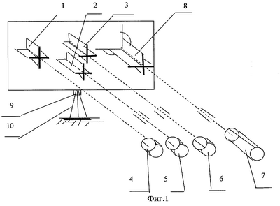 Коллимационные устройства 1, 2, 3 для выверки различных типов приборов 4, 5, 6 и орудия 7 представляют собой традиционный крест, отличающийся перпендикулярным смещением от плоскости щита 8 на расстояние около 8…10 см. Выверочный щит 8 имеет устройство крепления 9 на треноге 10. (фиг.1). При смещении приборов или орудия от линии визирования видимое в прибор изображение коллимационных устройств теряет крестообразную форму. Выверку заканчивают, когда наблюдаемое коллимационное устройство имеет вид перекрытия (фиг.2 и 3).