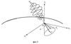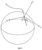 На фиг.1 показаны плоские траектории спуска ЛА из начальной точки О в точку цели Ц, формируемые в рамках известного способа управления спуском. Пунктиром показана траектория баллистического спуска ЛА без совершения маневра, через Xц и Yц обозначены оси целевой системы координат. Формирование навесной траектории спуска (отмечена цифрой 1) обеспечивается выбором требуемого направления вектора конечной скорости ЛА в точке цели под заданным углом к плоскости горизонта в точке цели. Соответственно, формирование настильной траектории (отмечена цифрой 2) обеспечивается выбором требуемого направления вектора скорости под меньшим углом . Таким образом, формирование плоских траекторий спуска заданной конфигурации осуществляется в известном способе путем фиксации в алгоритмах наведения угла ц. На фиг.2 показана пространственная траектория спуска, формируемого в рамках известного метода путем задания линии пикирования по направлению вектора конечной скорости ЛА в точке цели, ориентированного под углами ц и ц (угол бросания и курсовой угол) относительно целевой системы координат ЦХцYцZц таким образом, формирование пространственных траекторий спуска, в том числе подлетных с заданного направления, осуществляется в известном способе путем фиксации в алгоритмах наведения двух углов ц и ц. На фиг.3 показана схема формирования спиралевидных траекторий спуска ЛА путем программного вращения с периодом Т направления вектора конечной скорости по образующей прямого кругового конуса с вершиной в точке цели Ц и с углом полураствора . Направление осевой линии конуса (вектор ) задается углами как это показано на фиг.2. Таким образом, согласно заявленному способу формирования траекторий спуска постоянные значения углов и заменяются в алгоритмах наведения их переменными значениями, определяемыми зависимостями