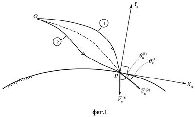Известен способ формирования траекторий спуска аэробаллистического ЛА в заданную точку цели – навесных, настильных, подлетных с заданного направления и др. [1], включающий задание требуемого направления вектора конечной скорости ЛА в точке цели, построение целевой системы координат, связанной с заданным направлением конечной скорости, формирование программ требуемых ускорений ЛА в проекциях на картинную плоскость наведения, нормальную к направлению конечной скорости, нахождение закона изменения параметров управления спускаемым ЛА из динамических уравнений движения ЛА с определением действительных параметров движения ЛА с помощью бортовой навигационно-измерительной системы.