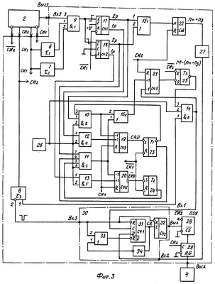 После появления положительного перепада на выходе второго разряда счетчика 17 схема И 10 (фиг.4p) начинает пропускать импульсы с генератора 26 на вход обратного счета счетчика 19 и через схему ИЛИ 16 на вход прямого счета суммирующего счетчика 21. Кроме того, положительный перепад с выхода второго разряда счетчика 17 через схему ИЛИ 15 запишет “1” в счетчик 22. Счетчик 21 считает до обнуления счетчика 19, в момент перехода через “0” счетчик 19 вырабатывает на выходе обратного переноса отрицательный строб, который устанавливает триггер 23 в состояние “1”, при этом на его инверсном выходе появляется низкий уровень, поступающий на вход 3 схемы И 10, счетные импульсы на вход счетчика 21 больше не поступают.