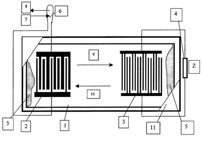 Поэтому величина отраженного импульса 10 будет зависеть от величины Z, которая может быть чувствительна к различным физическим воздействиям (температура, давление, влажность, ионизирующее излучение, электромагнитное излучение) и наличию некоторых веществ. Далее отраженный импульс ПАВ 10 с помощью ВШП 2 преобразуется в электромагнитный импульс, который излучается антенной 6 обратно к опрашивающему устройству. Часть импульса ПАВ 9 излучается к одному торцу звукопровода, а часть проходит под ВШП 3 к другому торцу звукопровода и отражаются от них. При некоторых значениях импеданса Z4 коэффициент отражения может стать близким к нулю и отраженные от торцов сигналы будут больше, чем отраженный от ВШП 3 сигнал, что внесет искажения и сделает невозможным контроль физической величины. Чтобы этого не происходило, на торцы наносятся акустопоглотители 5, которые делают отраженные сигналы менее значений, которые учитываются опрашивающим устройством.