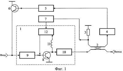 Наиболее близким к заявляемому объекту по максимальному числу существенных признаков является полосовой усилитель мощности, содержащий каскад усиления, имеющий вход усиливаемого сигнала, соединенный с входом полосового усилителя мощности, и выход усиливаемого сигнала, цепь обратной связи, в состав которой входят направленный ответвитель, выполненный в виде двух связанных линий, вход первой из которых нагружен на согласованную нагрузку, детектор, вход которого подключен к выходу первой связанной линии, блок управления, вход которого соединен с выходом детектора, биполярный транзистор, база которого соединена с выходом блока управления, а коллектор или эмиттер – с общим проводником, эмиттер или коллектор биполярного транзистора образует выход цепи обратной связи, подключенный к входу полосового усилителя мощности, а вход второй связанной линии подключен к выходу каскада усиления, при этом ее выход образует выход полосового усилителя мощности [2, рис.3].