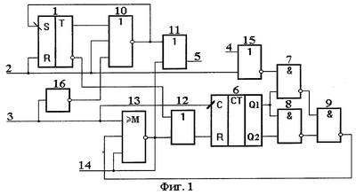 R-вход триггера 1 подключен к шине разрешения преобразования 2, первому входу двухвходового элемента ИЛИ-НЕ 15 и первому входу трехвходового элемента ИЛИ-НЕ 10. Выход трехвходового элемента ИЛИ-НЕ 10 соединен с S-входом RS-триггера 1 и со вторым входом первого элемента ИЛИ 11. Выход первого элемента ИЛИ 11 соединен с выходной информационной шиной 5, а первый вход соединен с первым входом второго элемента ИЛИ 12, первым входом и выходом мажоритарного элемента 13 и шиной выходных тактовых импульсов 14. Выход второго элемента ИЛИ 12 соединен с R-входом счетчика 6, а второй вход – с инверсным выходом триггера 1. Прямой выход триггера 1 соединен со вторым входом трехвходового элемента ИЛИ-НЕ 10, третий вход трехвходового элемента ИЛИ-НЕ 10 соединен с выходом инвертора 16, вход которого соединен с шиной тактовых импульсов 3, вторым входом мажоритарного элемента 13 и С-входом счетчика 6. Выход второго разряда счетчика 6 соединен с первым входом первого элемента И-НЕ 8, выход первого разряда счетчика 6 соединен со вторым входом первого элемента И-НЕ 8 и с первым входом второго элемента И-НЕ 7. Второй вход второго элемента И-НЕ 7 соединен с выходом двухвходового элемента ИЛИ-НЕ 15. Второй вход двухвходового элемента ИЛИ-НЕ 15 соединен с входной информационной шиной 4. Выходы второго и первого элементов И-НЕ 7, 8 соединены с первым и вторым входами третьего элемента И-НЕ 9 соответственно. Выход третьего элемента И-НЕ 9 соединен с третьим входом мажоритарного элемента 13.