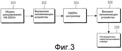 Со ссылкой на Фиг.3 PDU включает в себя модуль 300 декодирования HS-DSCH, внутреннее запоминающее устройство 302, блок 304 управления HSDPA, внешнее запоминающее устройство 306, блок 308 распределения переупорядочивания очереди. Несмотря на то, что предпочтительные варианты осуществления описывают внутреннее и внешнее запоминающее устройство, настоящее изобретение не ограничено запоминающим устройством, которое является физически внешним и внутренним для самого PDU. До описания настоящего изобретения принимается, что промежуточный минимальный TTI-интервал определен, чтобы быть особым значением 1, в качестве обозначенного «промежуточным минимальным TTI-интервалом = 1» в настоящем изобретении, и также принимается, что ошибка CRC отсутствует в принятом PDU MAC-hs, то есть выполнена операция приема максимума данных, если бы даже они могли быть представлены в реализованной системе.