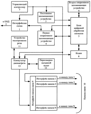Достижение вышеуказанного технического результата обеспечивается тем, что в устройстве сопряжения оконечного оборудования данных с каналом связи, включающем интерфейс канала связи, сопрягаемый с каналом связи и предназначенный для приема из канала входящего сигнала данных и передачи в канал исходящего сигнала данных; первое оперативное запоминающее устройство для хранения массивов цифровых данных; кодек для осуществления периодической выборки входящего сигнала данных с целью ее последующей записи в первое оперативное запоминающее устройство, а также для приема последовательности исходящих цифровых данных, формируемой в первом оперативном запоминающем устройстве, и ее преобразования в исходящий сигнал данных; интерфейсную схему, подсоединенную к первому оперативному запоминающему устройству и оконечному оборудованию данных для обмена данными между оконечным оборудованием данных и первым оперативным запоминающим устройством, дополнительно включены блок цифровой обработки сигналов, второе оперативное запоминающее устройство, постоянное запоминающее устройство, управляющий контроллер, переговорно-вызывной пульт, коммутатор данные/речь, при этом блок цифровой обработки сигналов соединен с кодеком, первым оперативным запоминающим устройством, вторым оперативным запоминающим устройством и постоянным запоминающим устройством; управляющий контроллер подключен к интерфейсной схеме, постоянному запоминающему устройству, первому оперативному запоминающему устройству, блоку цифровой обработки сигналов, коммутатору данные/речь и интерфейсу канала связи; коммутатор данные/речь подключен к интерфейсу канала связи, кодеку и переговорно-вызывному пульту; интерфейс канала связи выполнен в виде набора интерфейсов, сопрягаемых с каналообразующей аппаратурой каналов связи различного типа и выбираемых по сигналу от управляющего контроллера; интерфейсная схема выполнена в виде набора интерфейсов, сопрягаемых с оконечным оборудованием данных различного типа и выбираемых по сигналу от управляющего контроллера, который выполнен в виде программируемого переключающего устройства, осуществляющего выбор режима работы по указанию оператора.